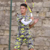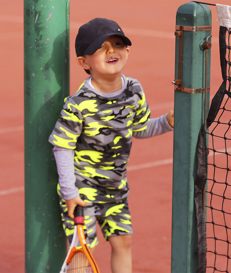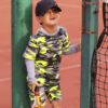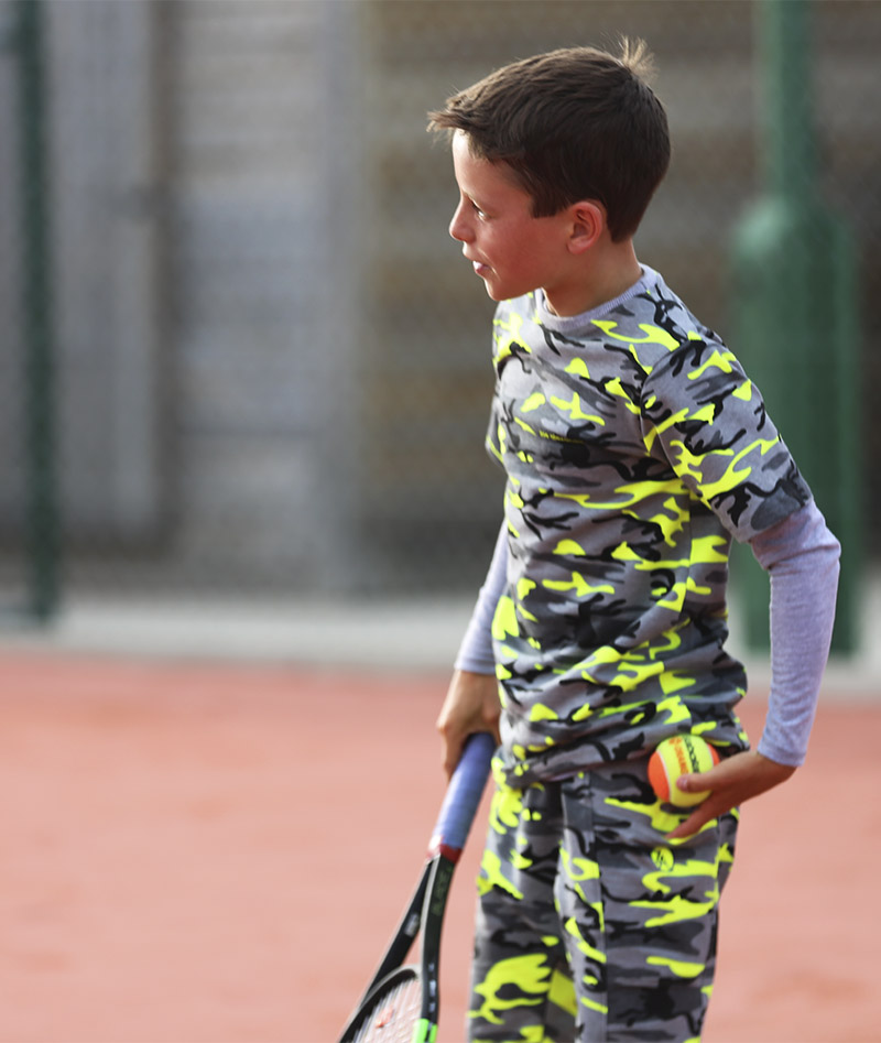 Here we show them worn with the matching neon top in the same high quality fabric and the light grey cotton tee as the Boys Tennis Outfit Neon Camo. Any guy dressed in this design deserves to be called a worthy warrior. Finishing touches include matching neon yellow trademark ZA logo on front of the pant leg. Eyes front soldier! Be prepared!