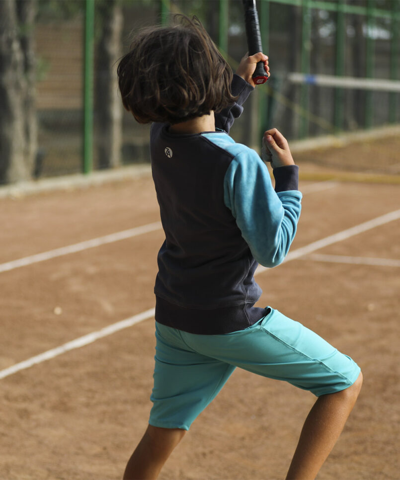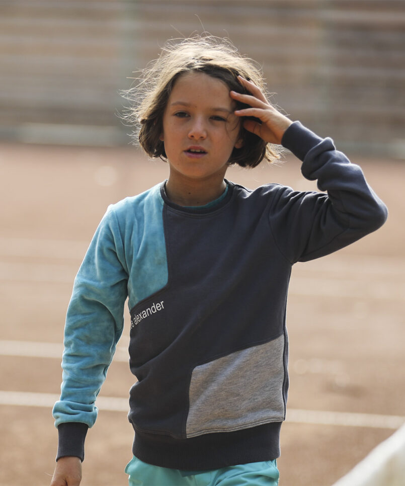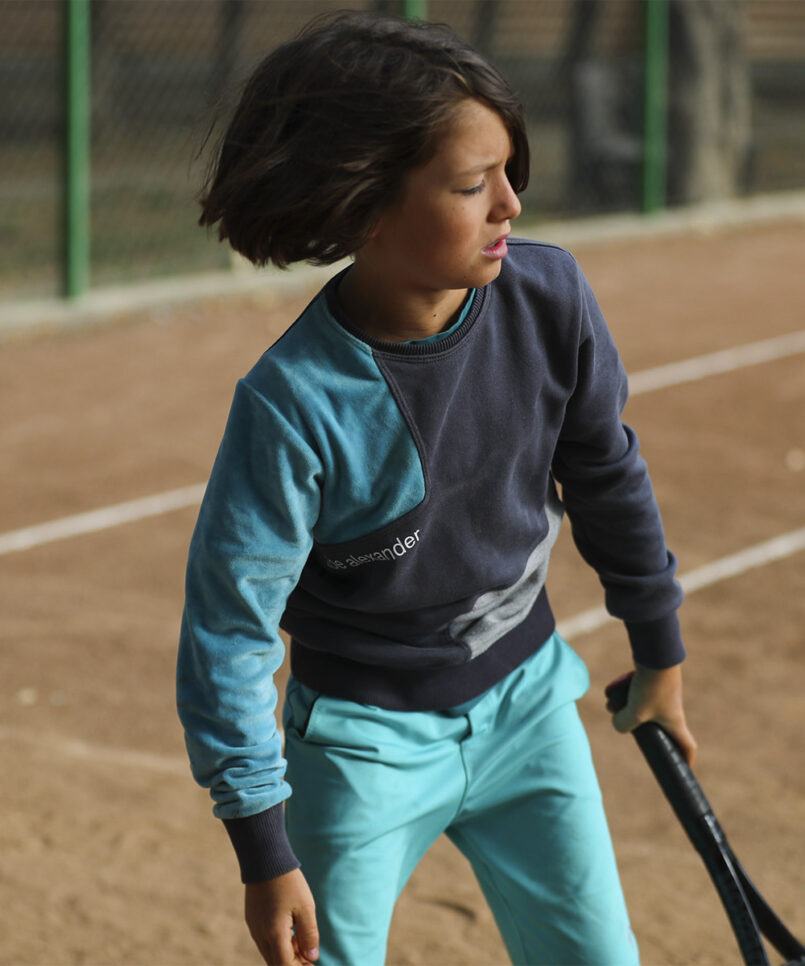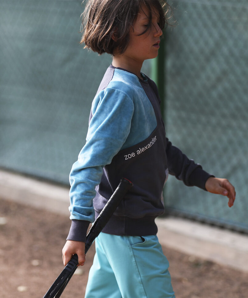 We welcome our new Gladiator Grigor to the battle, prepared for some serious racket work on court! He is ready to power up his pre-match prep! This stylish new designer long sleeve boys tennis sweatshirt training top with a novel Asymmetric Trapezium Block Pattern Effect chest design from Zoe Alexander is designed to complement the Grigor Boys Tennis Joggers. Our new aqua blue and charcoal grey/light grey tennis training top is sure to keep away the chills of early morning and evening training sessions. The aqua blue velvet effect right arm adds a new texture dimension to this designer tennis top.