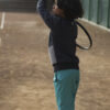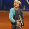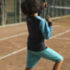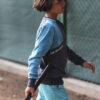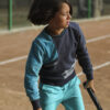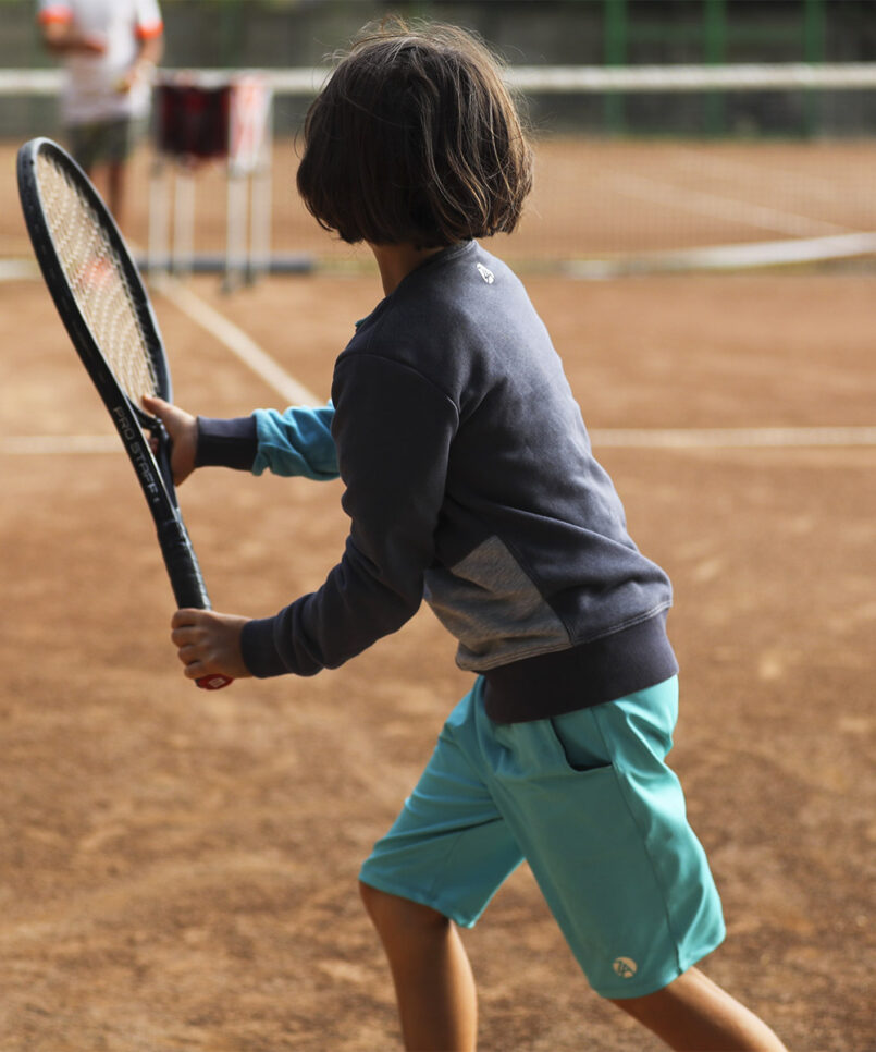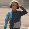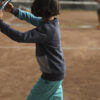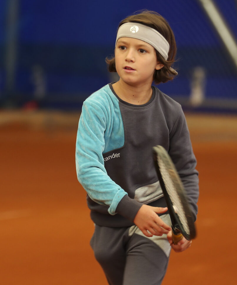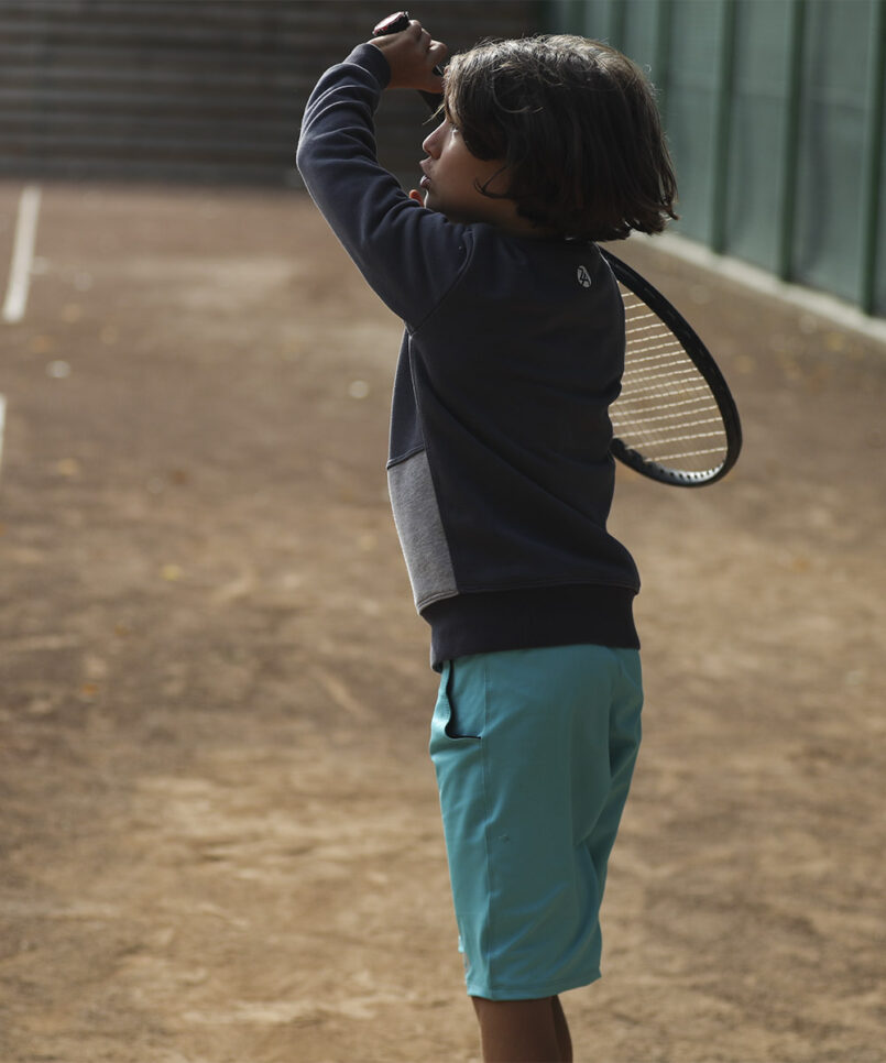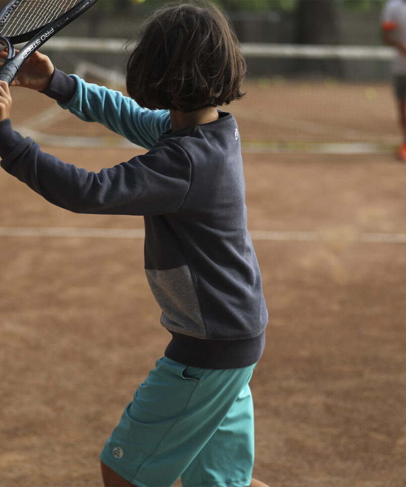 We welcome our new Gladiator Grigor to the battle, prepared for some serious racket work on court! He is ready to power up his pre-match prep! This stylish new designer long sleeve boys tennis sweatshirt training top with a novel Asymmetric Trapezium Block Pattern Effect chest design from Zoe Alexander is designed to complement the Grigor Boys Tennis Joggers. Our new aqua blue and charcoal grey/light grey tennis training top is sure to keep away the chills of early morning and evening training sessions. The aqua blue velvet effect right arm adds a new texture dimension to this designer tennis top.