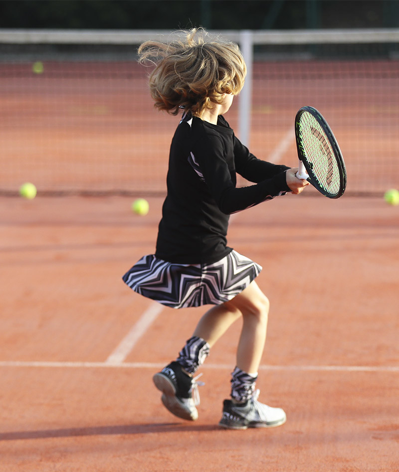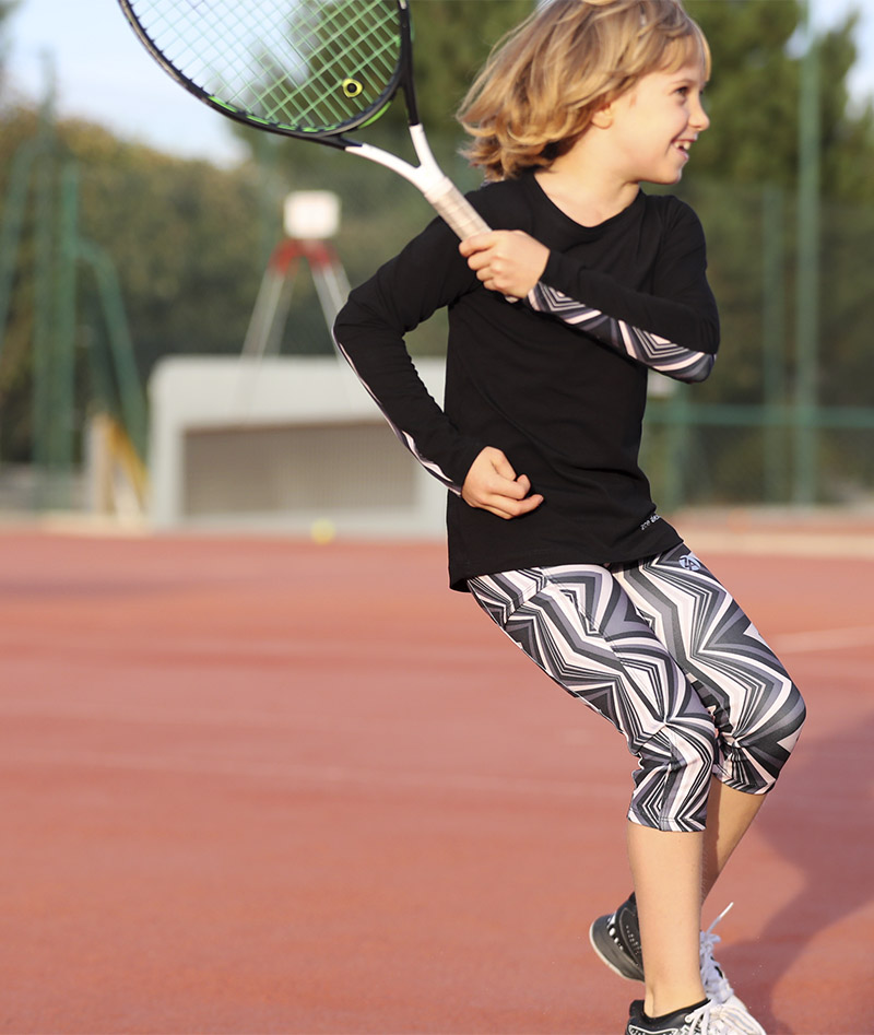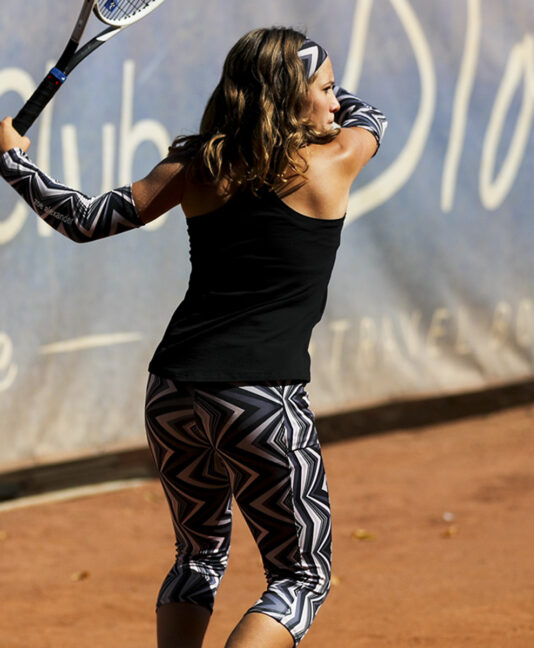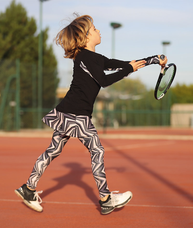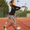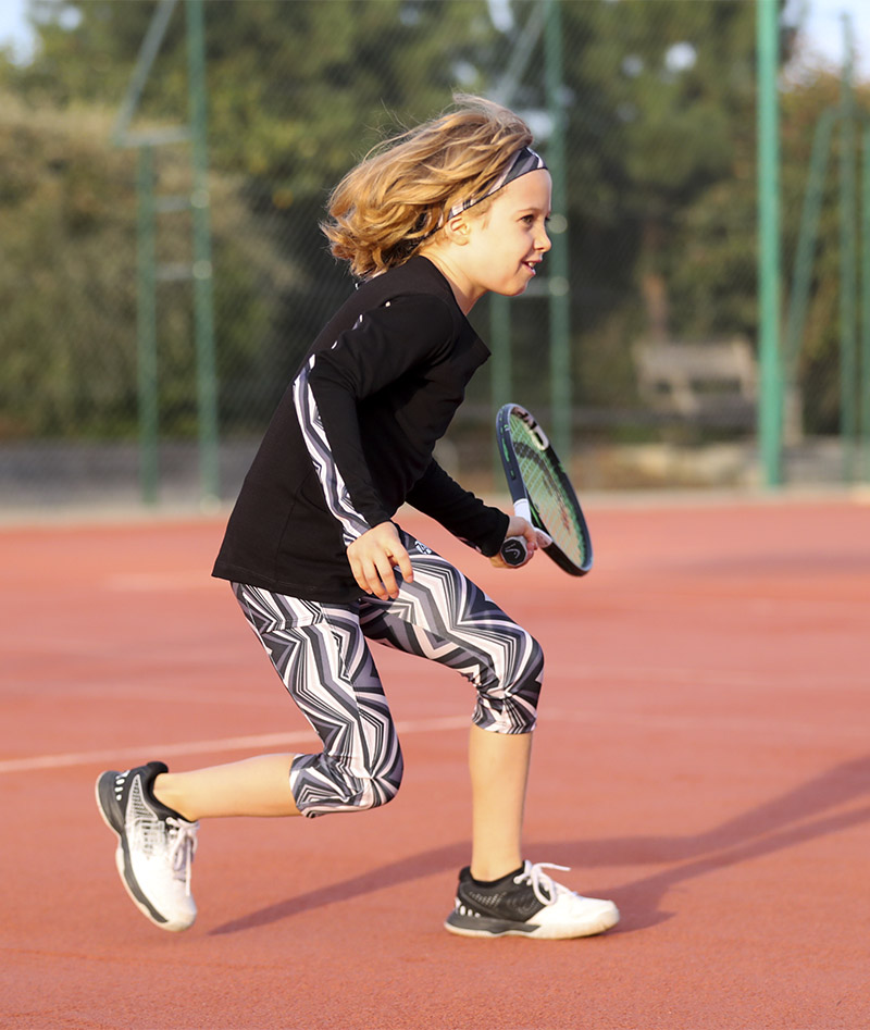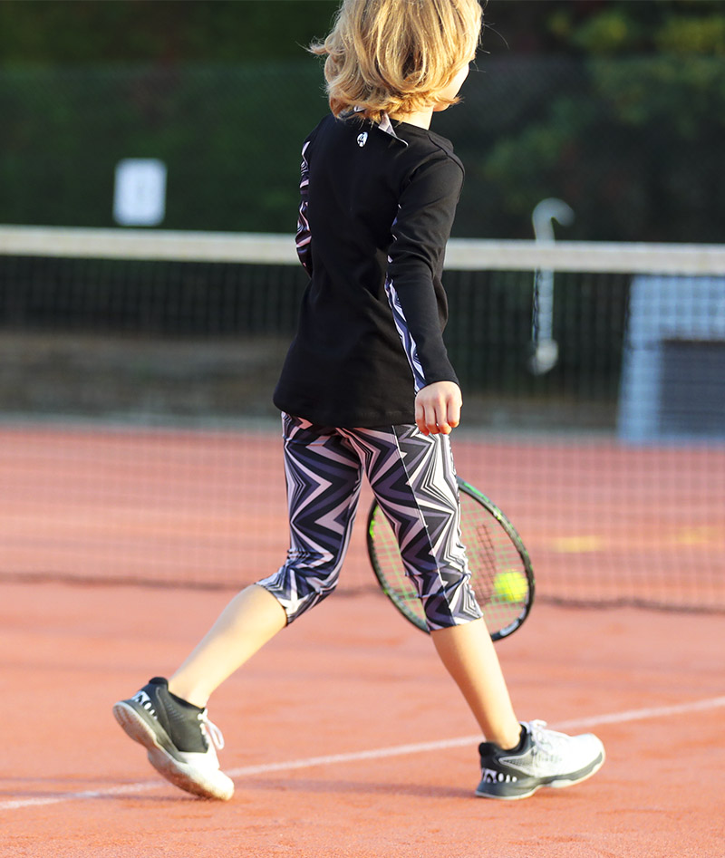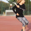 Welcome the new designer sports performance cotton Zigzag Long Sleeve Tennis Top by Zoe Alexander. We now have a stunning long sleeve black training tennis top with zigzag print insets on the arms designed to complement any of our new Zigzag range. This training top can be worn with our Zigzag Cropped leggings, our Zigzag Long Leggings or Zigzag Tennis Dress during her tennis training sessions. A “Must-Have” for all tennis players!