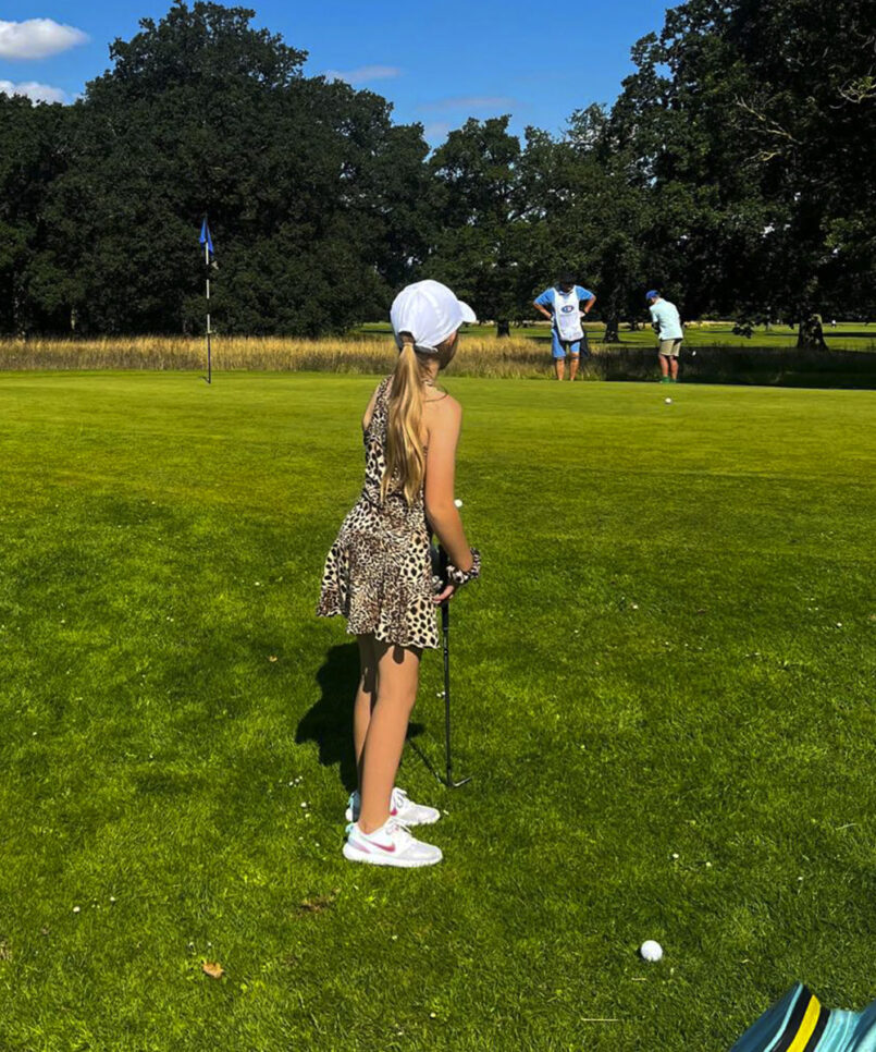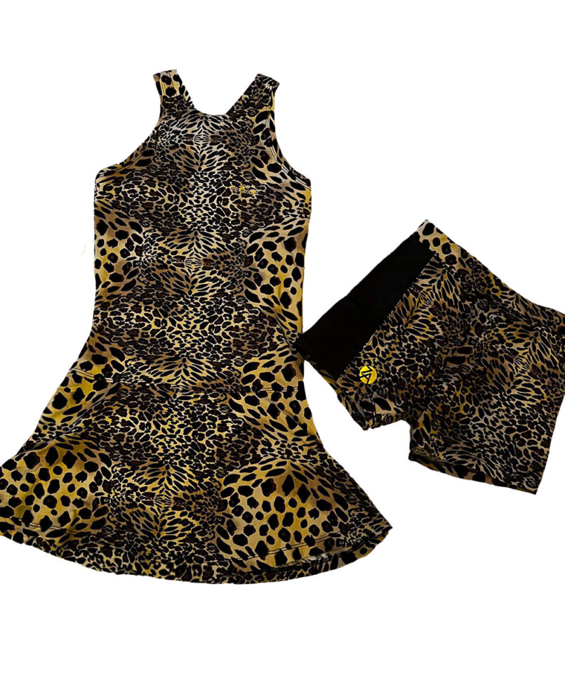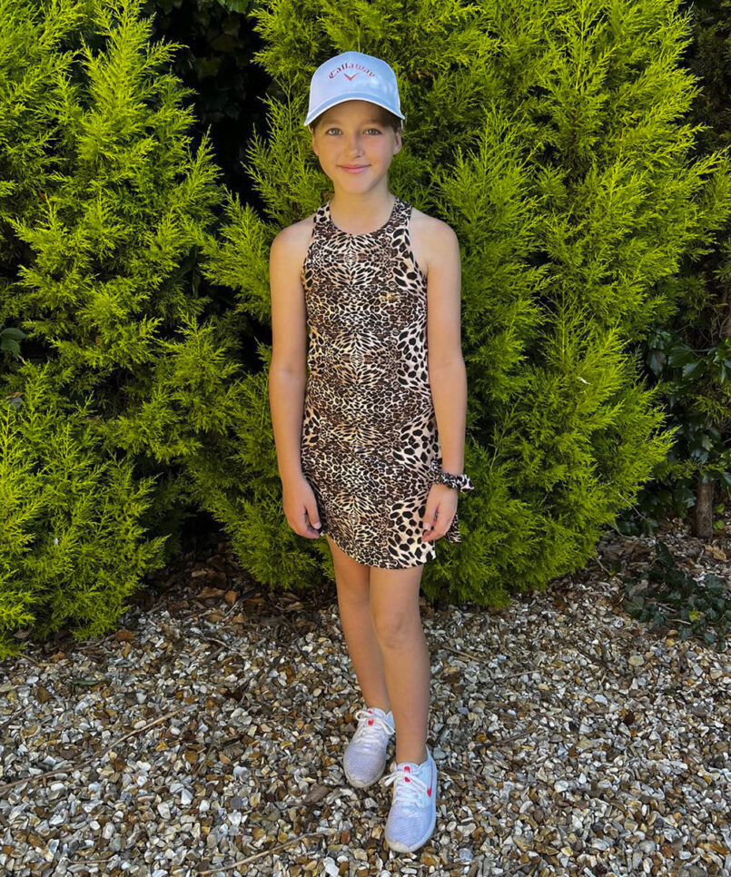 Zoe Alexander has released the gorgeous Lynx Animal Print Girls Golf Dress. She can dress to impress with this jaw-dropping big cat animal print golf dress. She will woo the crowds on the golf greens with this gorgeous racer back. An animal print dress with a high neckline and cross strap racerback design. A freely flowing skirt section puts the finishing touches to it. It also comes with a separate pair of magnificent, matching animal print shorts with pocket for ball and tees.