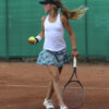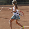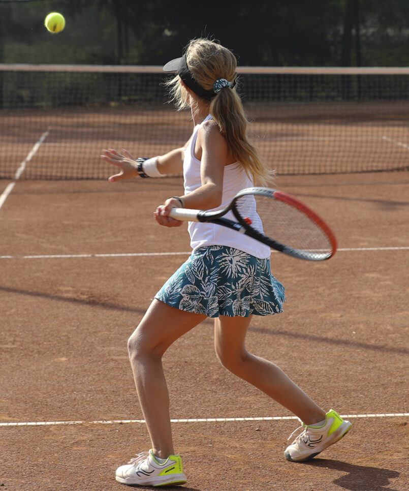Zoe Alexander has released the gorgeous Petrol Leaf Girls Tennis Skirt. She can dress to impress with this pretty petrol tennis skirt seen here with the new Sports Scallop Tank Top in white. She will woo the crowds on the tennis court with this gorgeous print skirt. It also comes with a separate pair of white cotton ball shorts with pocket.
