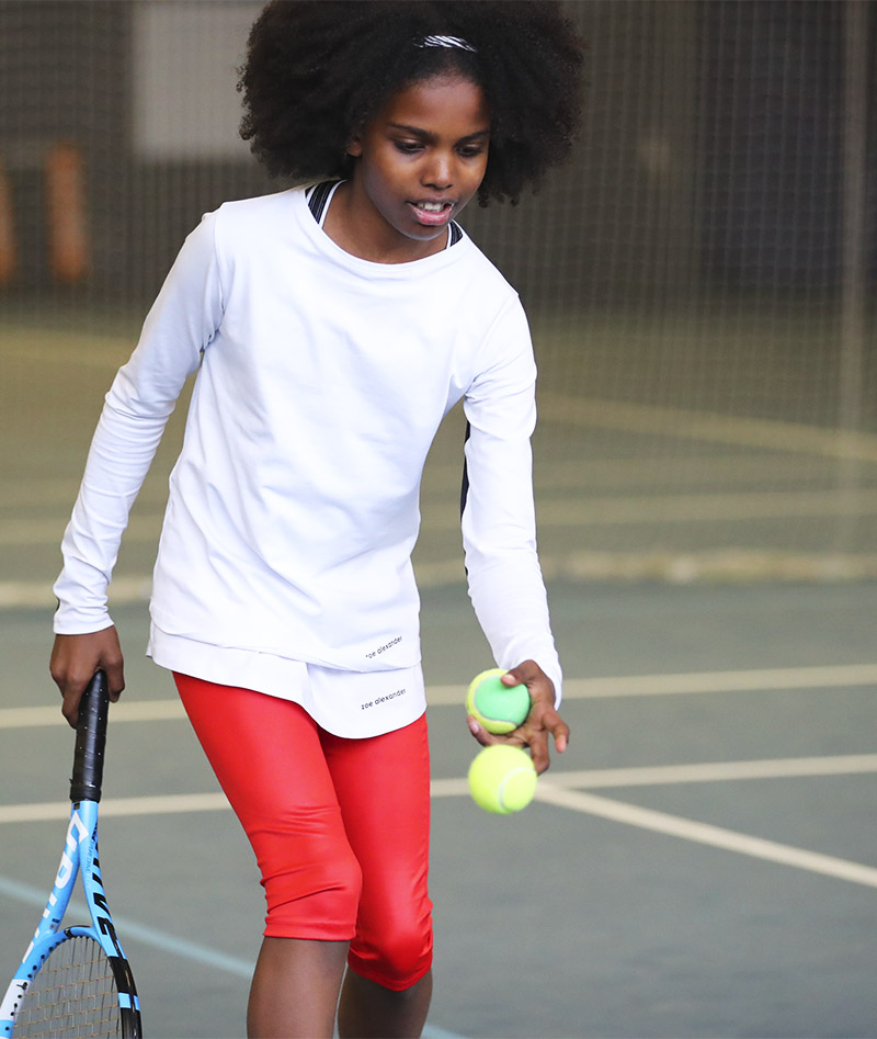 Born to Stand Out! New designer sports performance tennis cropped training leggings by Zoe Alexander. We have designed our new “Electric Red” tennis capri pants for girls with the now well known ball pocket. Available as right or left handed player versions these phenomenal new “below knee” cropped tennis leggings offer the player the certainty that the ball will stay in place during play. Made from stretch fabric they are comfortable, supportive and great to play in! A “Must-Have” for all tennis players!