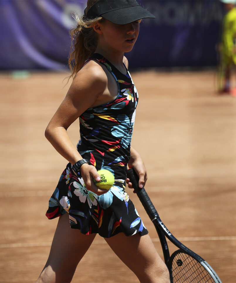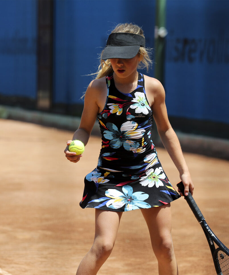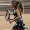 Here are the care and composition details for the Girls Tennis Floral Black Dress Racerback :-