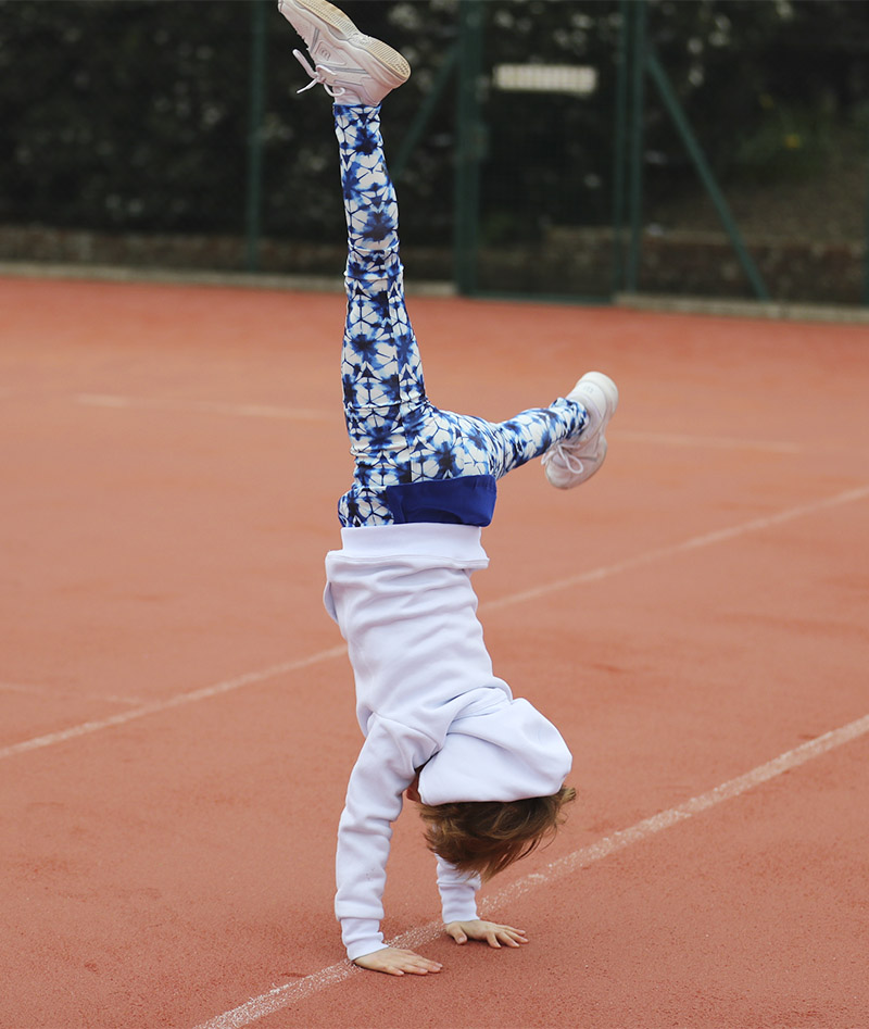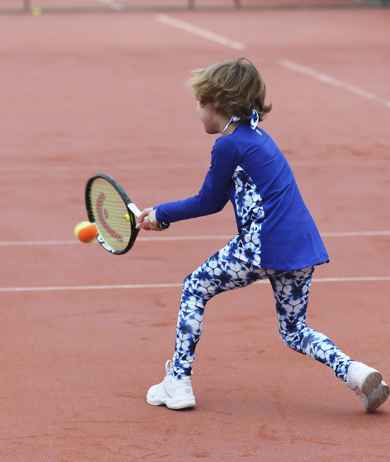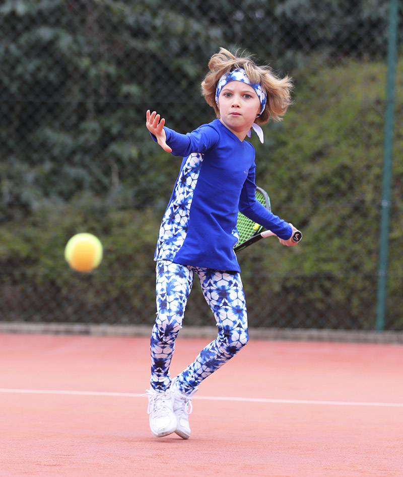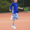 Here are the composition and care details for the Girls Tennis Long Leggings Blue Hex Print:-