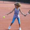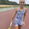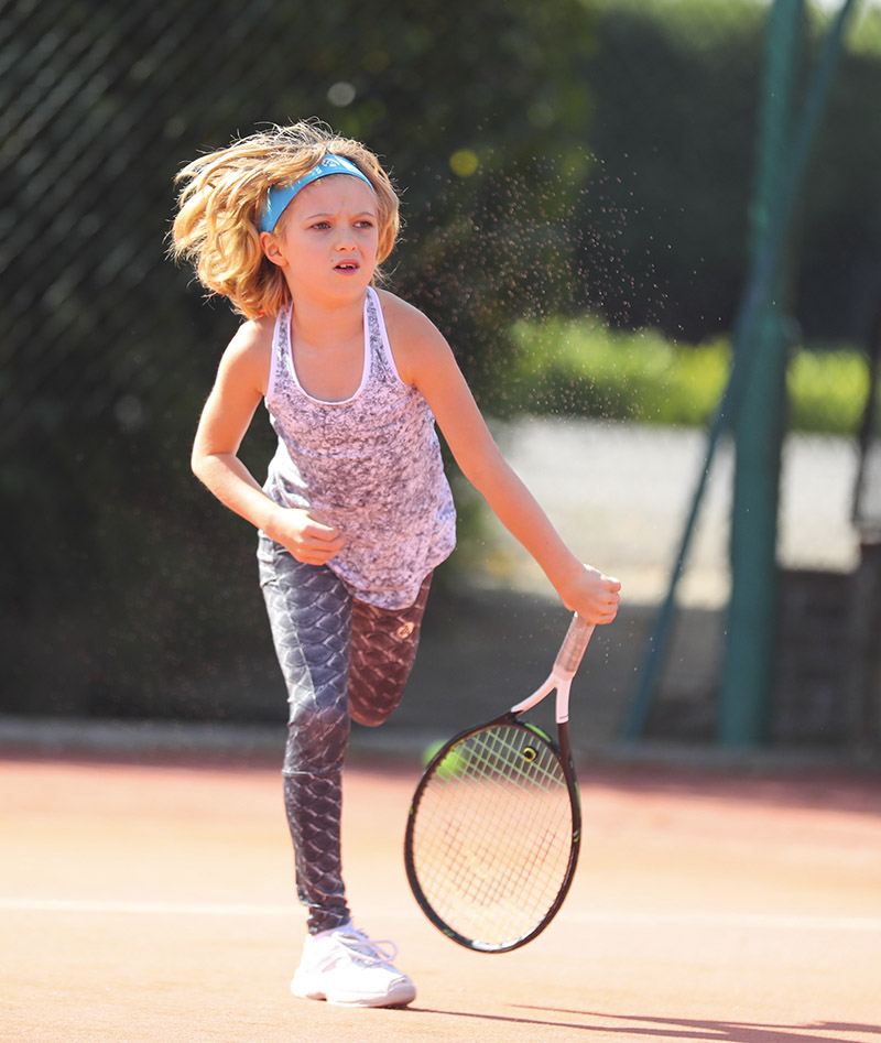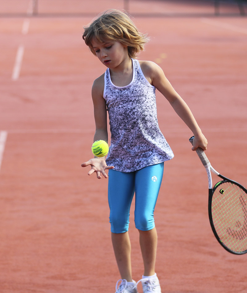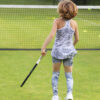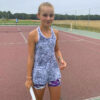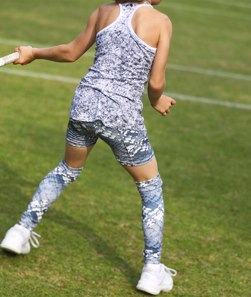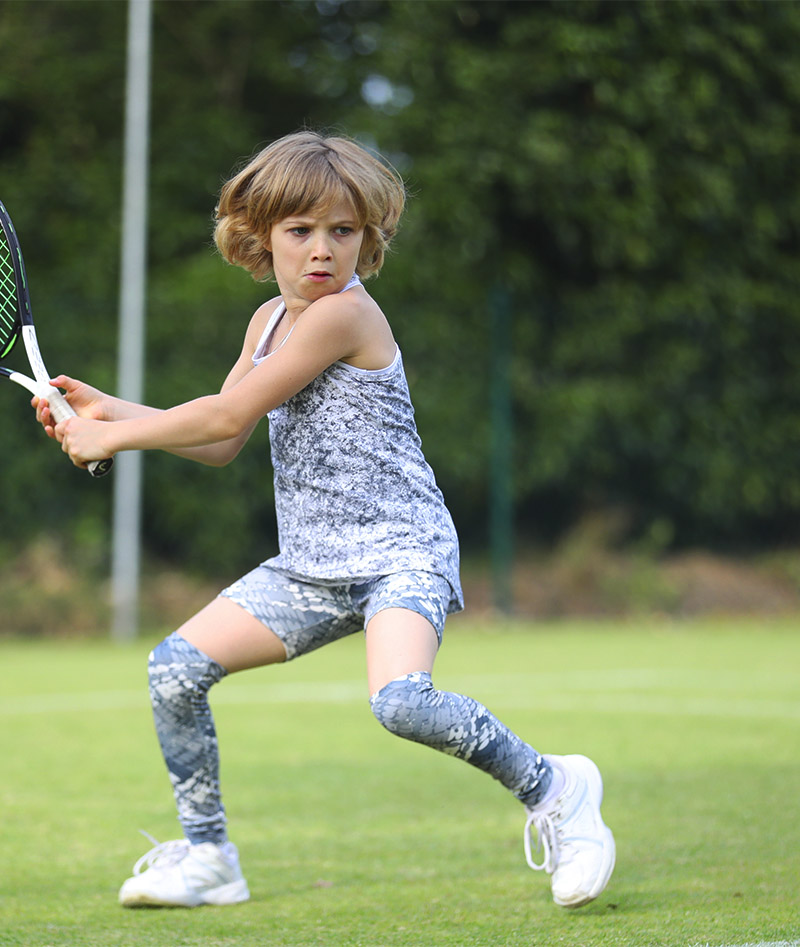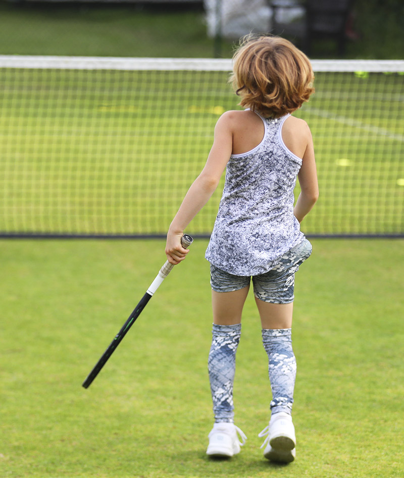 Welcome the new designer sports performance cotton Cloud Grey Girls Tennis Tank Top by Zoe Alexander. We now have a gorgeous smoky grey cloud print training vest tennis top with white trims designed to complement our Camo, Jennifer, Honey, Snakeskin, Crocodile or neon print shorts and leggings. Here our player is wearing with our Camo Violet Tennis Shorts. Another option could be our Jennifer Grey Tennis Shorts for her tennis training sessions. A “Must-Have” for all tennis players!