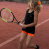 Welcome the new designer sports performance Girls Tennis Tank Top Ivanna by Zoe Alexander. We now have a stunning Black training vest top with Neon Orange shoulder straps designed to complement the Ivanna Tennis Collection. This top can be worn with the Neon Orange Cropped leggings or Shorts during her tennis training sessions. A “Must-Have” for all tennis players!