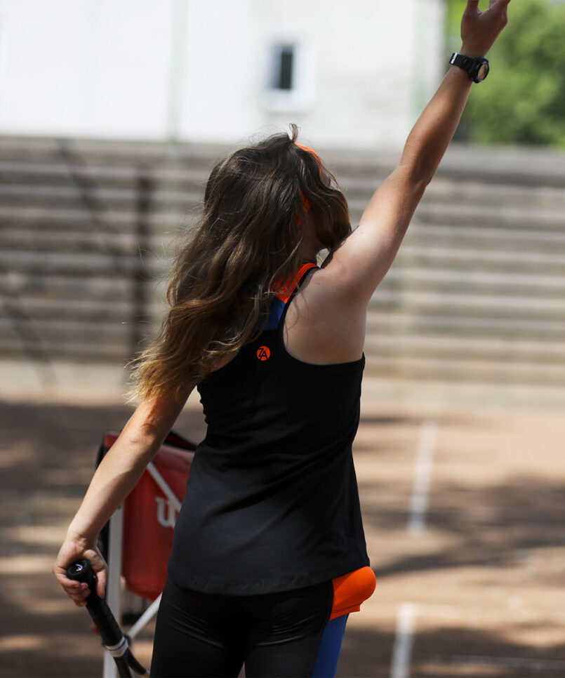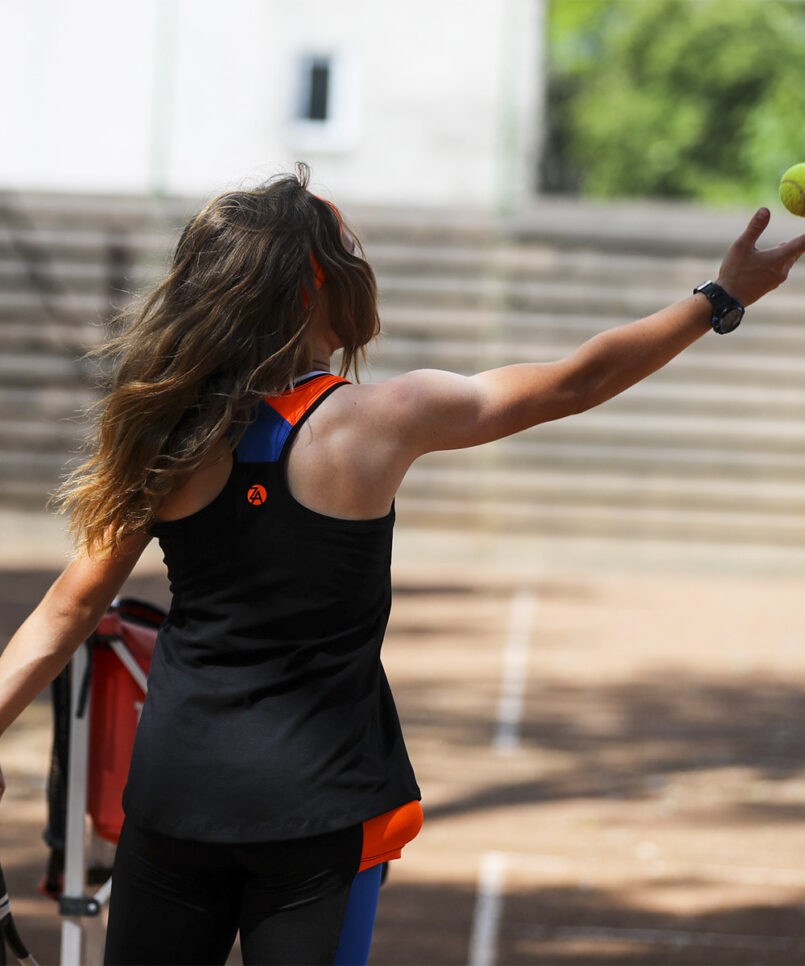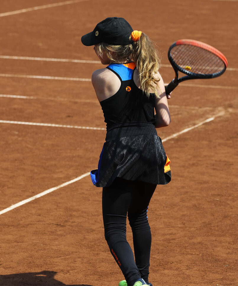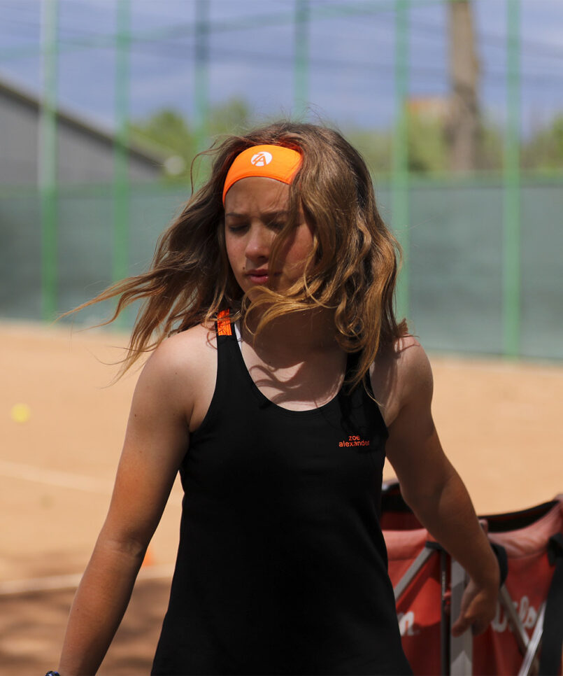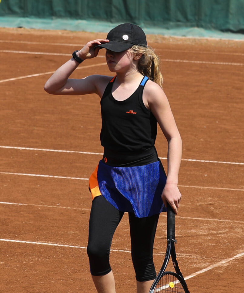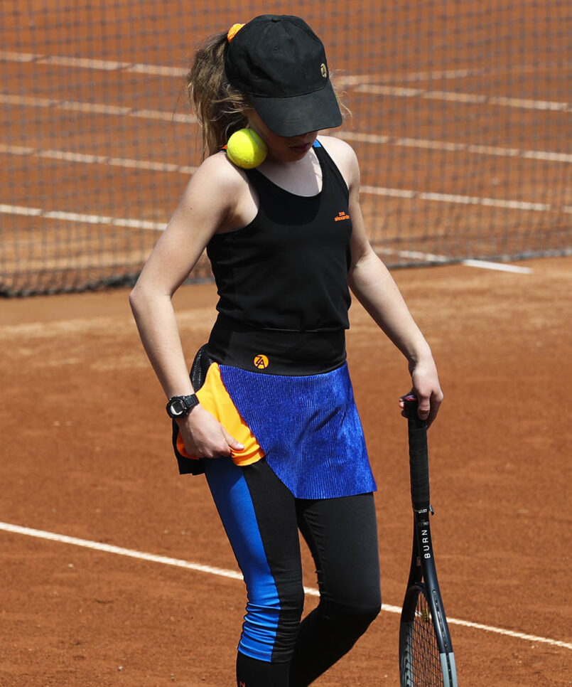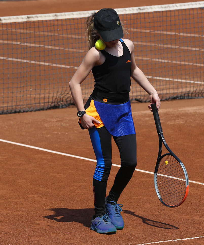 Welcome the new designer sports performance Madrid Open Tennis Vest by Zoe Alexander. We now have a stunning black training vest top with Neon Orange and Sax Blue Y-back designed to complement the Madrid Tennis Collection. This Tank Top Vest can be worn with the matching Madrid Cropped Leggings or Neon Orange Capri Pants during her tennis training sessions. We also have the new Madrid Open Crossover Tennis Skirt, a “Must-Have” for all tennis players!