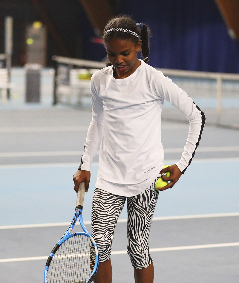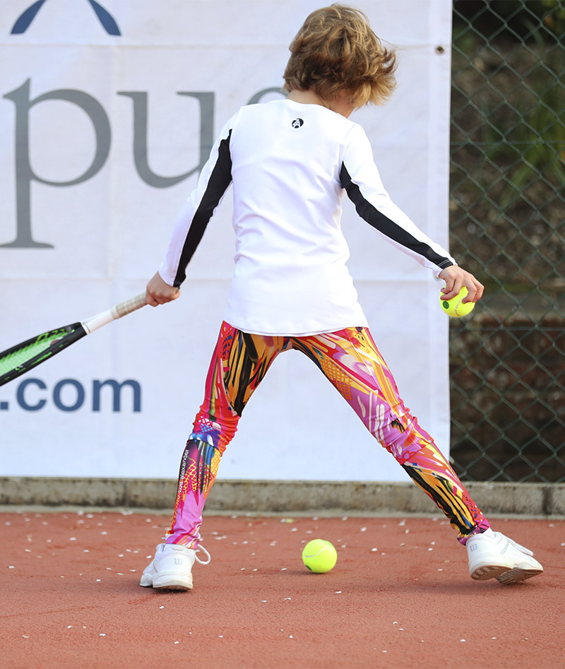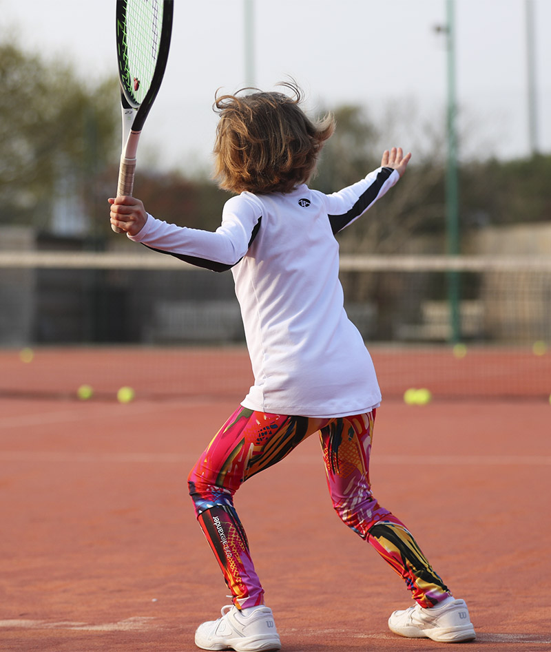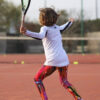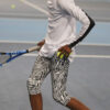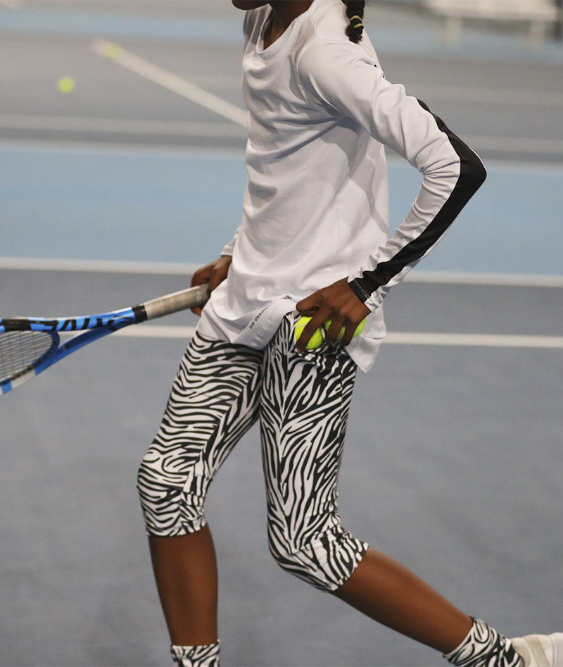 Welcome the new designer sports performance cotton Bianca Long Sleeve Tennis Top by Zoe Alexander. We now have a stunning long sleeve white training tennis top with satin black insets on the arms designed to complement any of our monochrome leggings. This training top can be worn with our Zebra Cropped leggings, our Black or White Training Leggings during her tennis training sessions. A “Must-Have” for all tennis players!