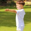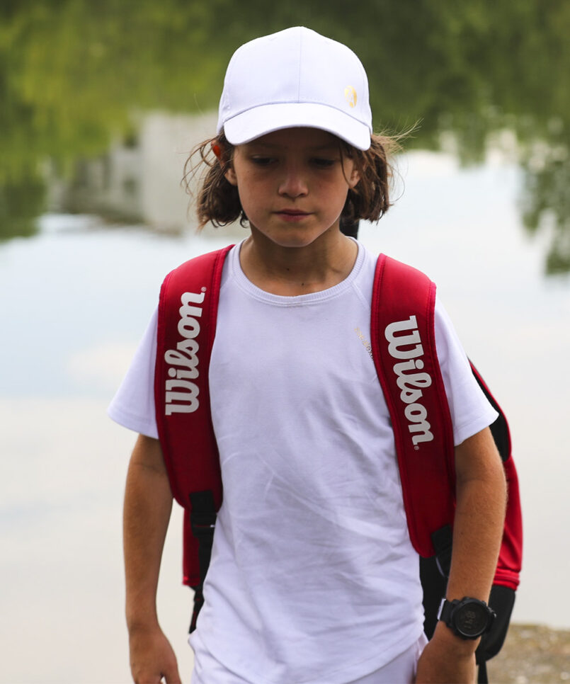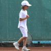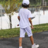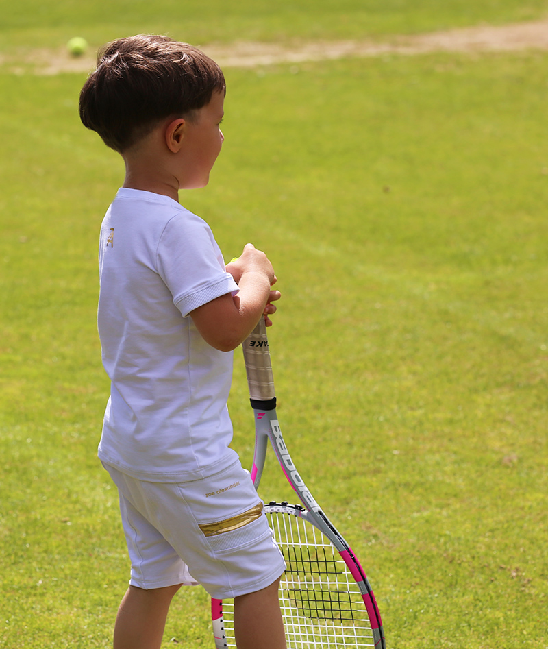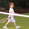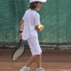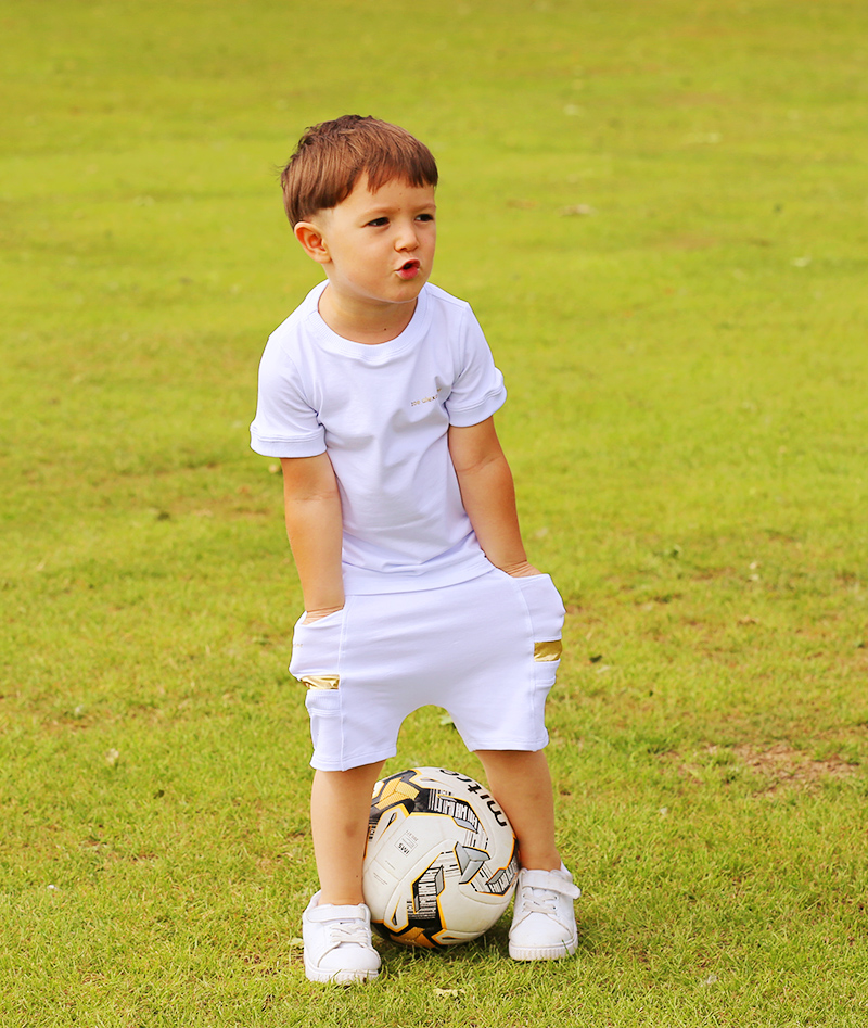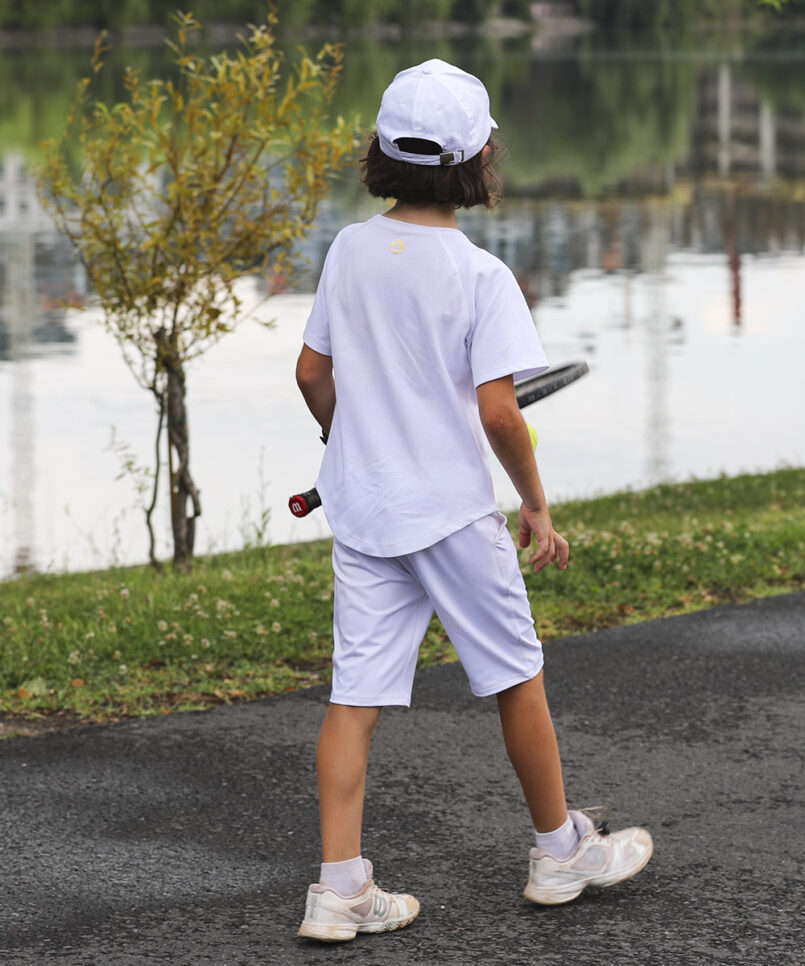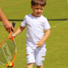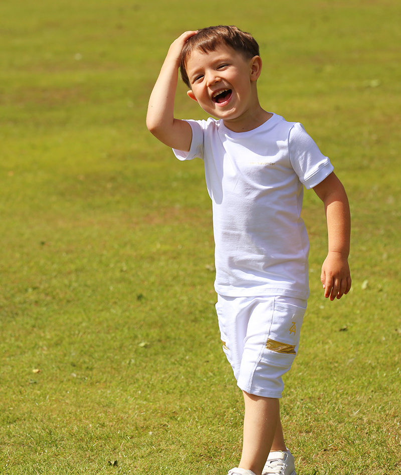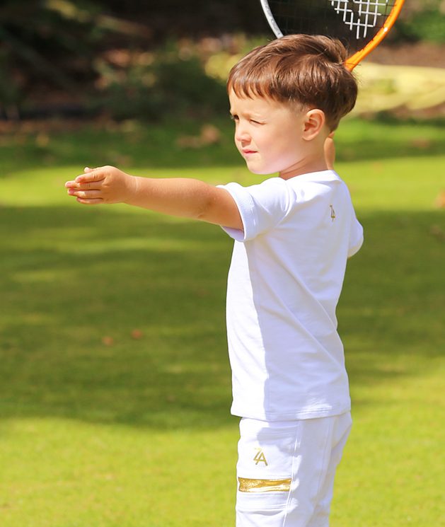 The new Wimbledon Boys Tennis Outfit! Dressed to impress! Tradition with contemporary style. Wear a Wimbledon winner with our new designer boys tennis clothing design from the Zoe Alexander collection, available as an all white tennis outfit with dashes of metallic gold from the logos that set him apart from the crowd both on and off the court! A cotton white Raglan Tee with white scalloped back, gold logos and performance white shorts with the ball pockets decorated with the Zoe Alexander gold logo, guaranteed to make everyone notice him!